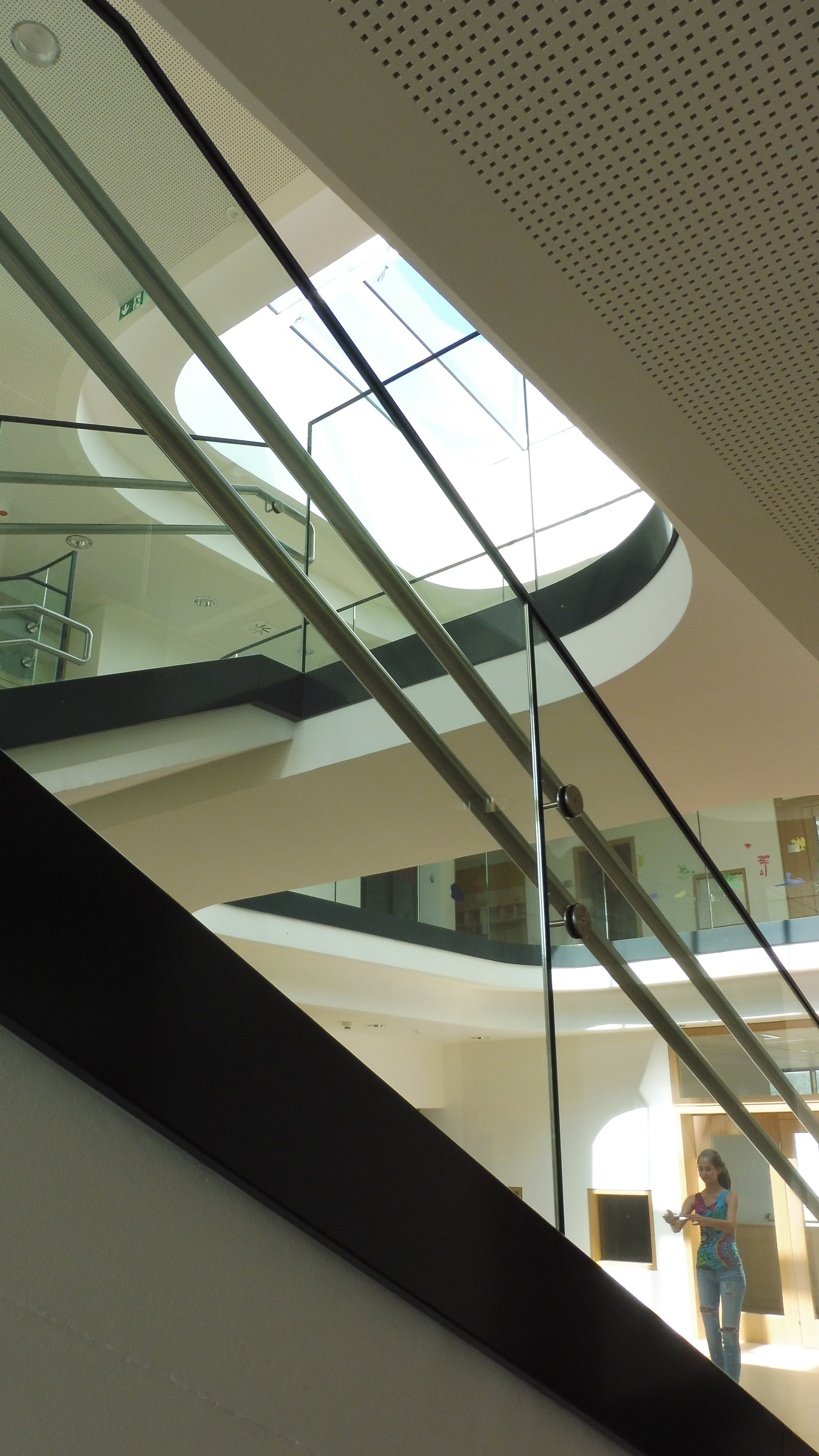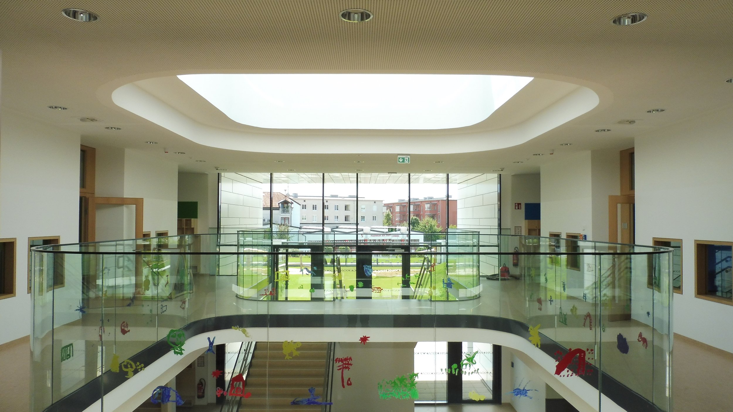 Die zweigeschossige Halle in der Gebäudemitte ist das Herz des Gebäudes. Direkt über den Haupteingang erreichbar werden von hier aus sämtliche Räume erschlossen. Ein offener Luftraum ins obere Geschoss erleichtert die Orientierung. Das darüber liegende Oberlicht führt viel natürliches Tageslicht in den zentralen Innenraum. Die großzügige helle Halle kann sehr gut für gemeinsame Aktivitäten wie Spiele Aufführungen, Ausstellungen etc. genutzt werden. Die umlaufende Galerie fungiert dabei als Zuschauergalerie.