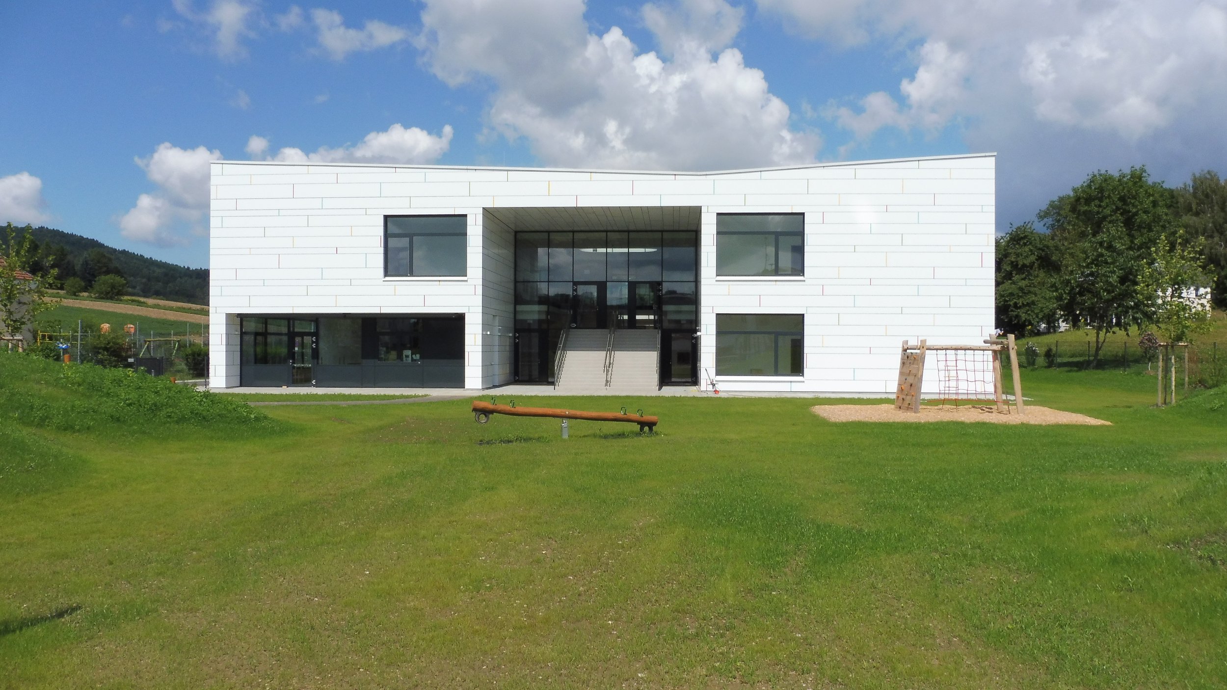 Die 7-gruppige Kinderbetreuungseinrichtung ist als kompaktes zweigeschossiges Gebäude mit einem quadratischen Grundrisszuschnitt konzipiert.